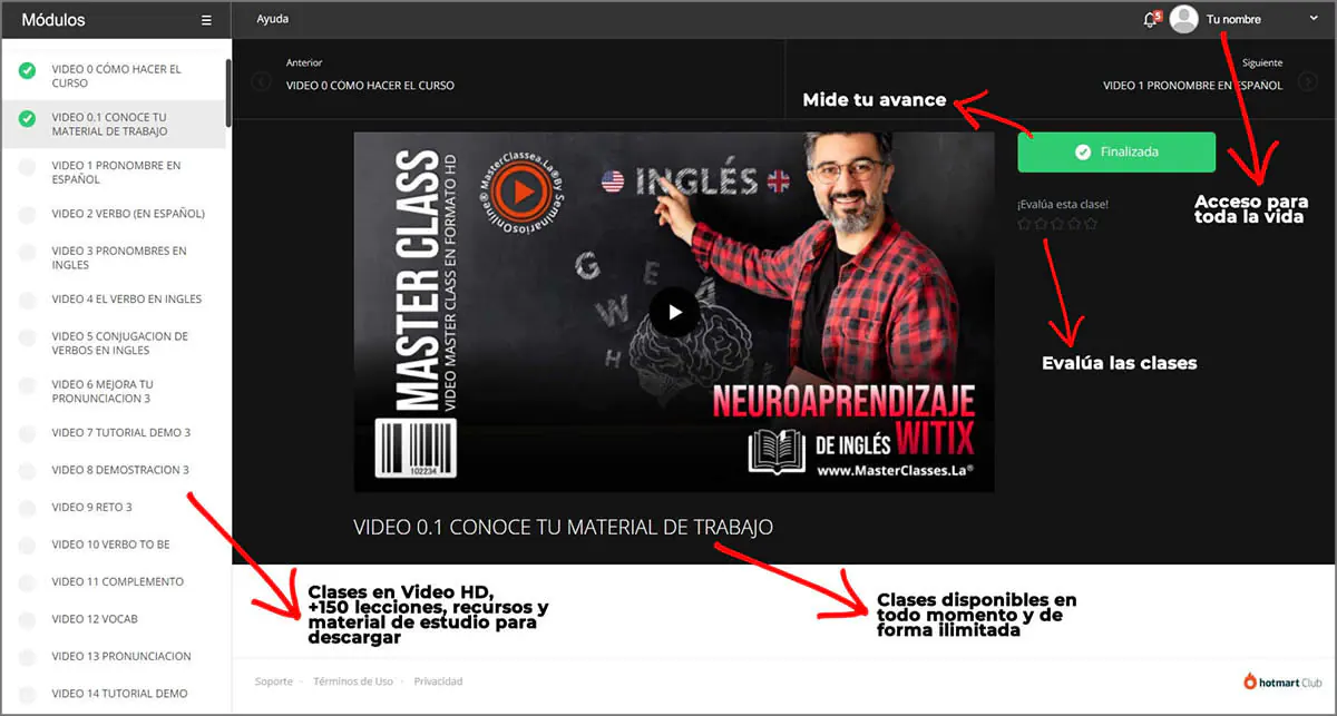 El Programa Académico Neuroaprendizaje de Inglés con Método Witix, contiene más de 153 lecciones en video de alta resolución más el material complementario de refuerzo que incluye un ebook (libro digital) y un repositorio de archivos desarrollados para ayudarte a obtener resultados desde el primer mes en adelante.